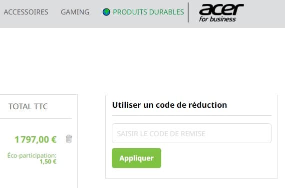 - Ensuite, repérez la section dédiée aux codes promotionnels nommée “Utilisez un code de réduction “ et entrez votre code promo Acer dans cette case.