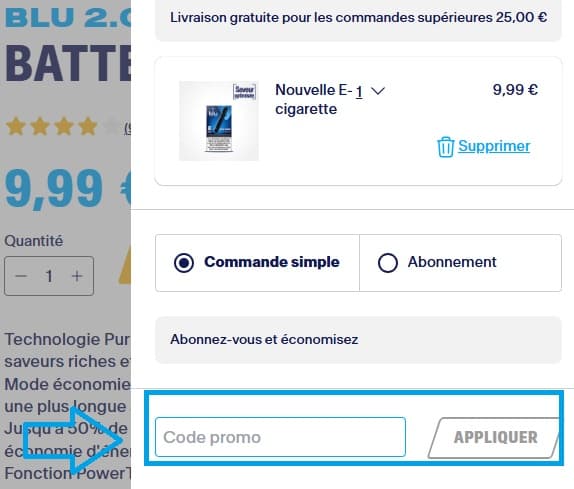 - Ensuite, repérez le champ nommé “Code promo”. Entrez votre code promo Blu dans ce champ, puis validez-le.