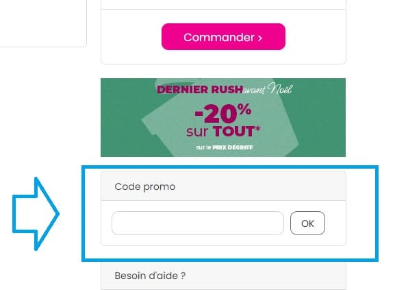 - Ensuite, repérez le champ “Code promo”. Saisissez-y le code de réduction Dégriffstock que vous avez choisi, puis validez pour appliquer la remise directement au montant total de votre commande.