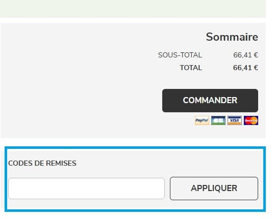 - À l’étape de validation de votre commande, cherchez le champ dédié aux codes promotionnels nommé “Codes de remises”.