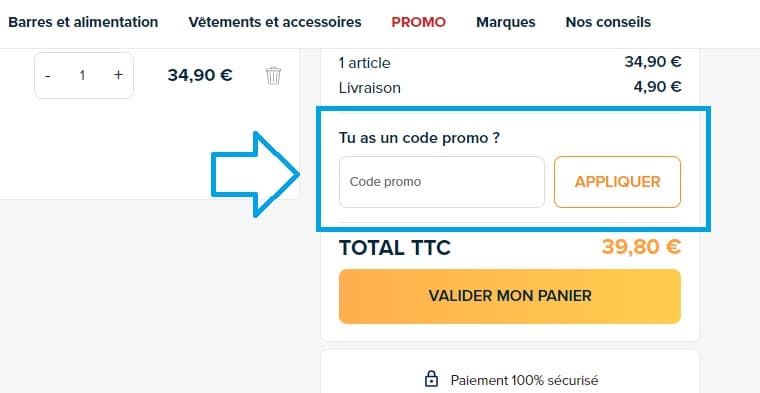 - Ensuite, repérez le champ “Tu as un code promo”. Saisissez-y votre code avantage Fitadium.
