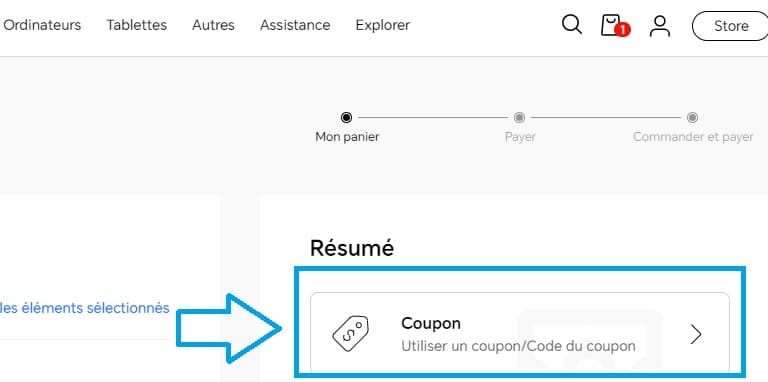 - Sur la page de paiement, recherchez la section " Coupon- Utiliser un coupon/Code du coupon" et collez votre code promotionnel HONOR dans cet espace et assurez-vous qu’il soit correctement appliqué avant de procéder à la validation de votre achat.