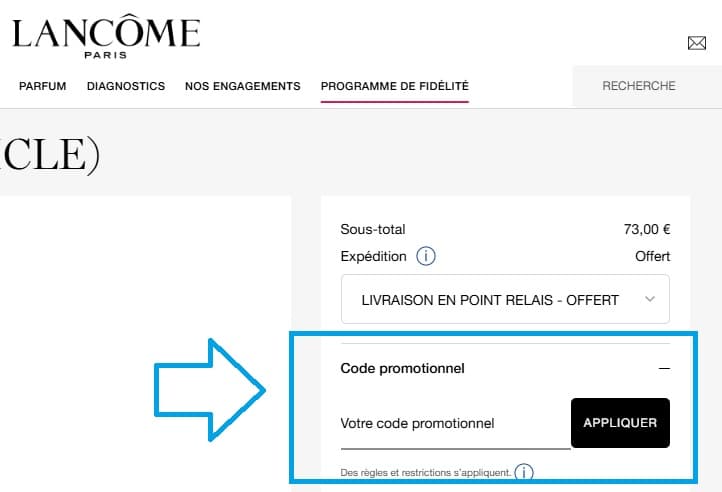 - Ensuite, recherchez l'espace intitulé “Code promotionnel”, puis entrez votre code promo Lancôme dans cette case pour activer la réduction.