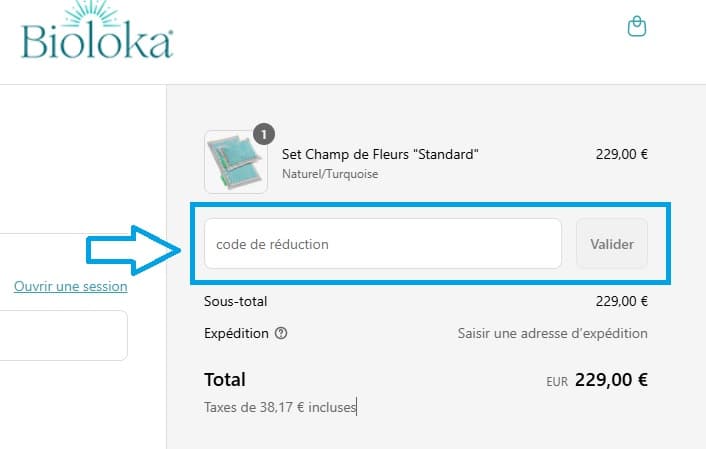 - Lorsque vous êtes prêt à finaliser votre commande, trouvez la section "Code de réduction". C’est là que vous pourrez entrer votre code promo Bioloka.