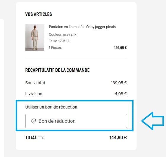 - Une fois votre shopping terminé, accédez à la page de paiement. Un encart prévu à cet effet vous permettra d’entrer votre code de réduction Marc O'Polo.