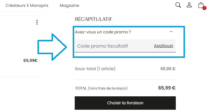 - Sur cette page, vous trouverez un champ intitulé “Avez-vous un code promo ?” et collez votre code promo Monoprix Mode & Maison dans ce champ.