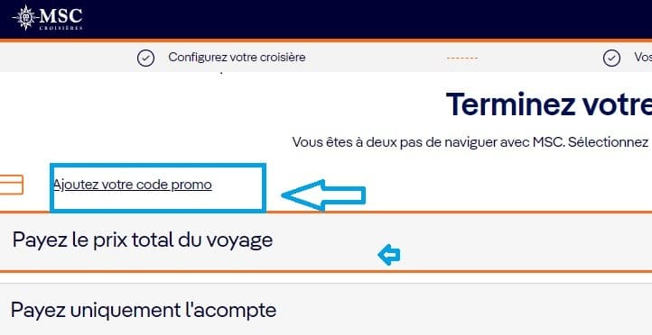 - Avant de finaliser votre réservation, cherchez le lien intitulé “Ajouter votre code promo”. Entrez votre code promo MSC Croisières dans ce champ pour appliquer la réduction.