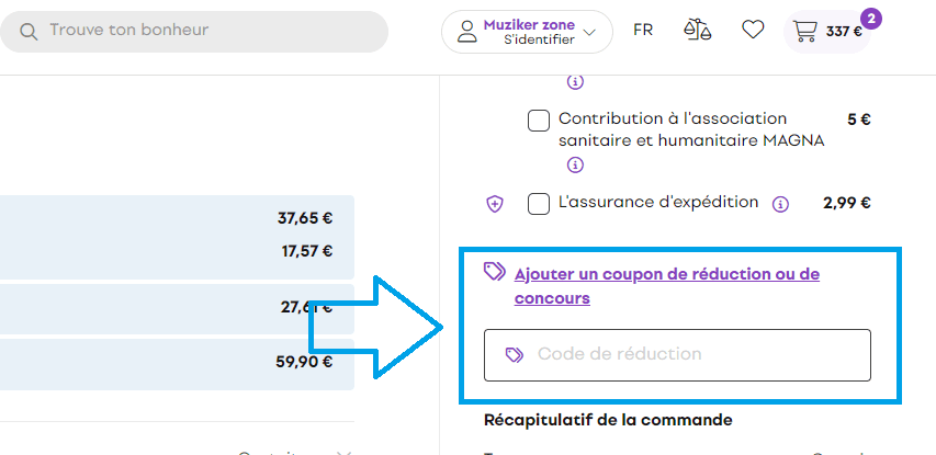 - Et avant de finaliser votre commande, repérez le champ intitulé “Coupon de réduction ou de concours” et collez-y votre code promo Muziker.