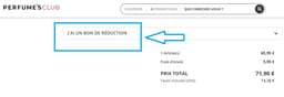 • Avant de finaliser la commande, repérez le champ intitulé "J'ai un code de réduction". Entrez votre code promo Perfume's Club dans ce champ. Assurez-vous que le code promotionnel a bien été appliqué, puis procédez à la validation de votre commande en ligne.