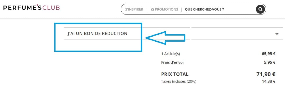 - Avant de finaliser la commande, repérez le champ intitulé "J'ai un code de réduction". Entrez votre code promo Perfume's Club dans ce champ. Assurez-vous que le code promotionnel a bien été appliqué, puis procédez à la validation de votre commande en ligne.
