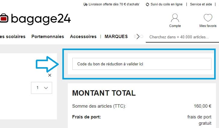 - Ensuite, repérez le champ « Code du bon de réduction à valider ici » lors du récapitulatif de votre commande et mettez votre code promotionnel Bagage24 dans ce champ.