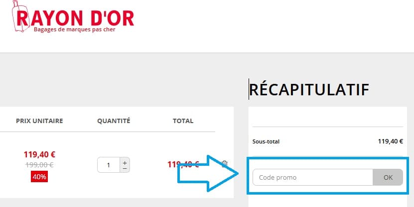 - Sur cette page, vous trouverez un champ nommé “Code promo”. C’est dans cet espace que vous devez insérez votre code de réduction Rayon d'or.