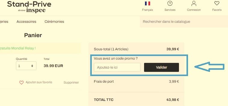 - Puis, repérez le champ « Vous avez un code promo ? » et entrez votre code de réduction Stand-Privé dans ce champ.