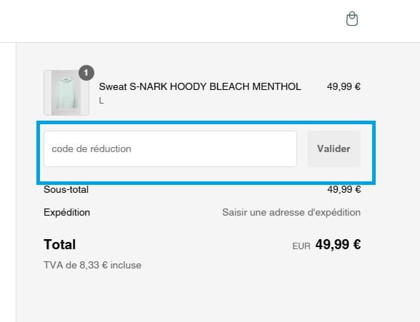 - Sur cette page, vous trouverez le champ nommé “Code de réduction”. Saisissez-y votre bon de réduction Teddy Smith.