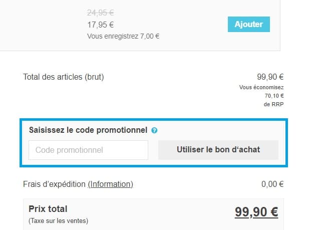 - Puis, cherchez la section intitulée “Saisissez le code promotionnel” et entrez votre code promo Tennis-Point dans cet espace.