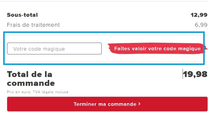 - Sur la page de paiement, trouvez la section " Votre code magique " et collez votre code promotionnel Vitrine Magique dans cet espace. Assurez-vous qu'il soit bien appliqué avant de valider votre achat.