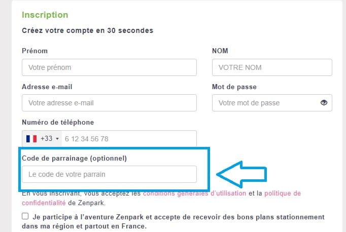 - Sur cette page, repérez le champ intitulé “Code de parrainage”. Saisissez-y votre code avantage Zenpark, puis appliquez-le à votre panier pour que la réduction soit automatiquement prise en compte dans le montant total de votre réservation.