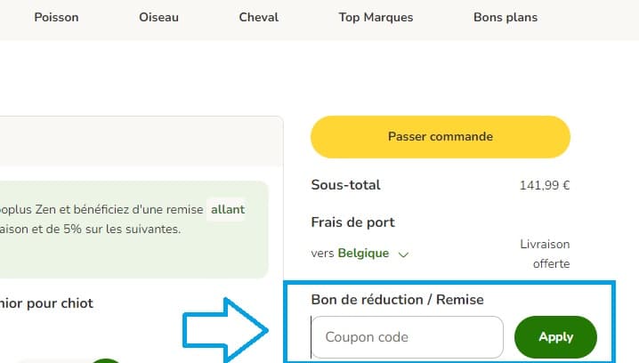 - Ensuite, appliquez à votre panier votre code de réduction Zooplus Belgique.