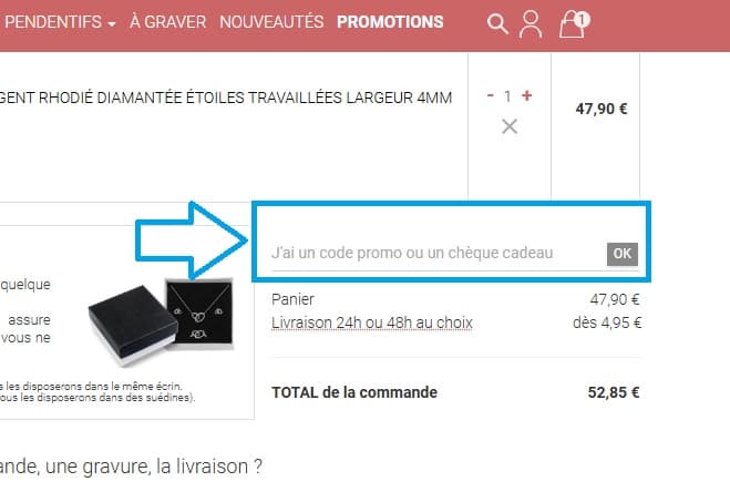 - Repérez la case “J’ai un code promo ou un chèque cadeau” et collez votre code avantage 1001 Bijoux.
