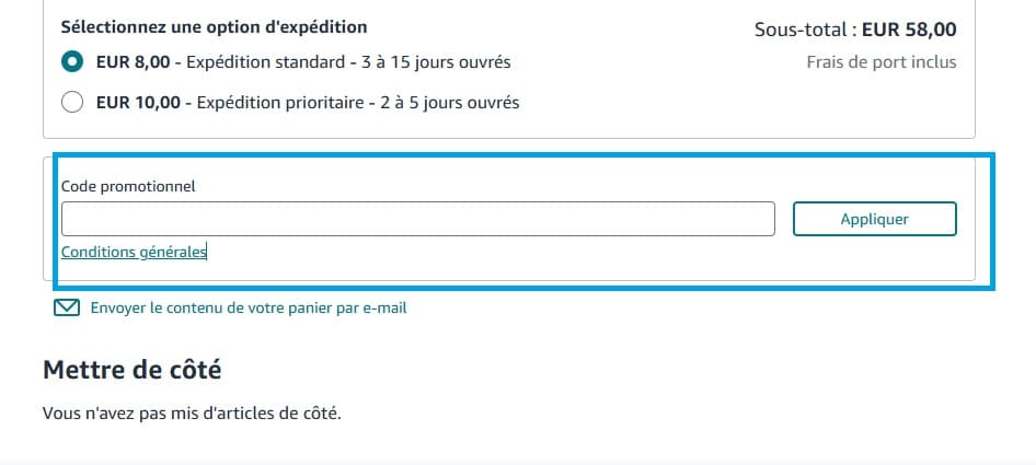 - Au moment de passer à la caisse, repérez le champ “Code promotionnel”.