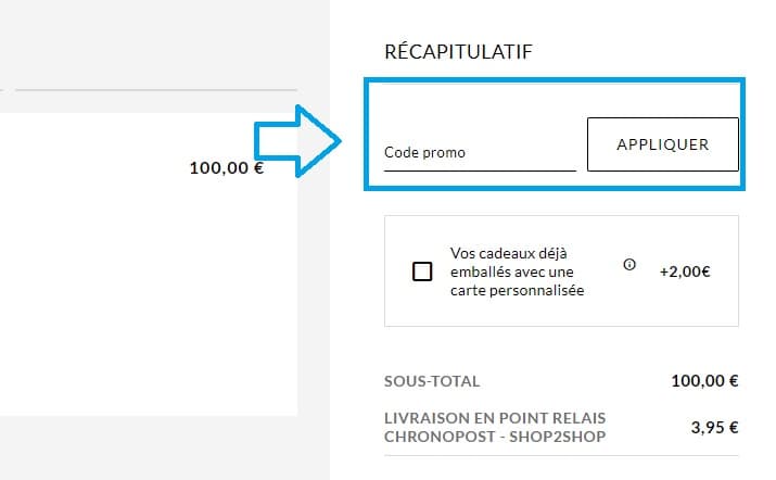 - Ensuite, recherchez l’espace nommé “Code promo”, saisissez votre code de réduction Aigle dans ce champ et appliquez-le à votre panier.