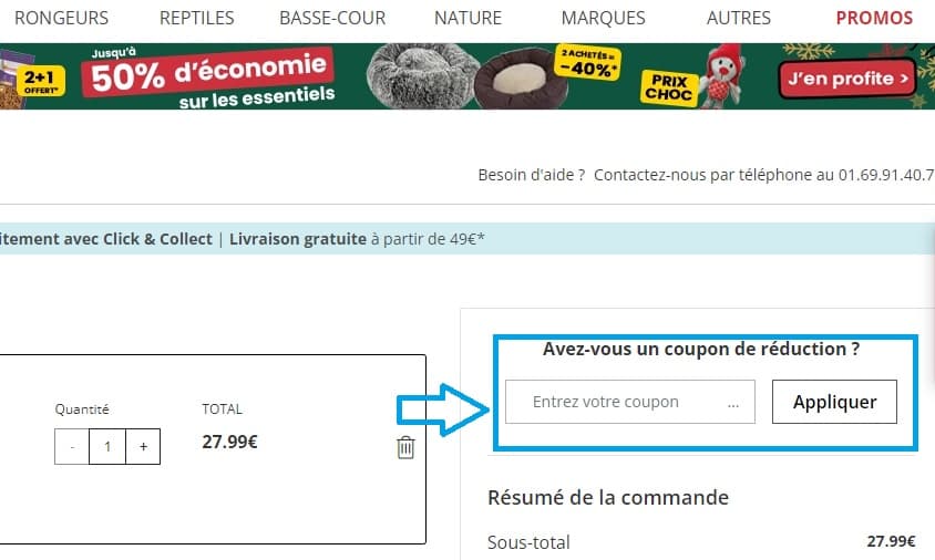 - Avant de finaliser votre achat, localisez le champ intitulé “Avez-vous un coupon de réduction ?”. Entrez votre code de réduction Animalis dans cette case et cliquez sur “Appliquer” pour activer la réduction.
