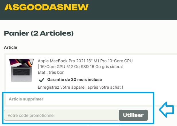- Ensuite, localisez le champ "Votre code promotionnel" et entrez votre code de réduction Asgoodasnew dans cet espace.