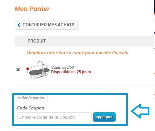- Lors du processus de paiement, localisez la case "Code Coupon" et entrez votre code de réduction Bébé Top dans cet espace.