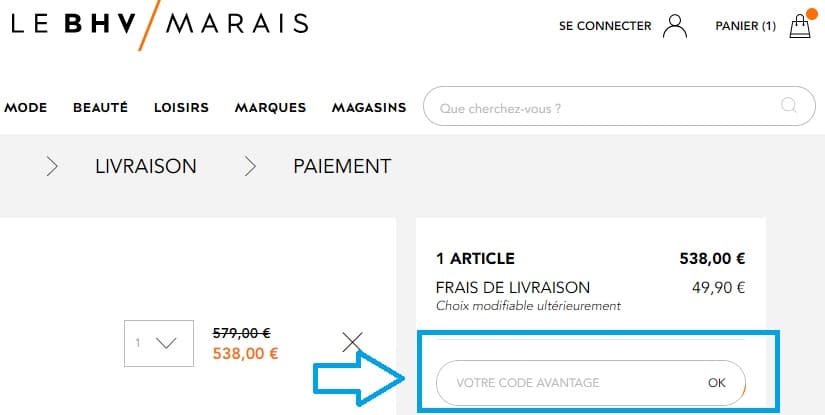 - Dans le récapitulatif, trouvez la case “Votre code avantage” et saisissez-y votre code promo Le BHV Marais.