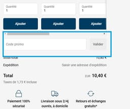 - Vous y trouverez une section intitulée "Code promo", insérez votre code avantage Biolane dans cette case et cliquez sur "Valider" pour l’appliquer à votre panier.