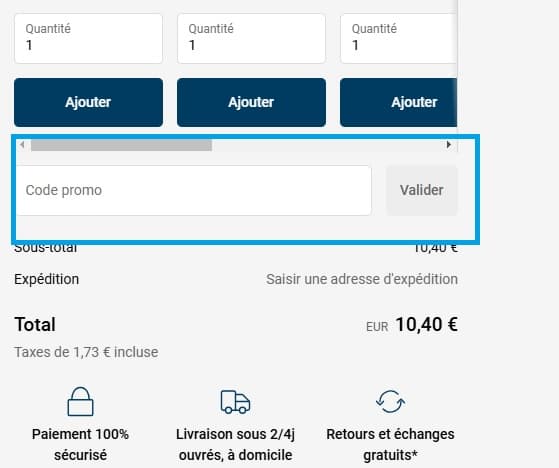 - Vous y trouverez une section intitulée "Code promo", insérez votre code avantage Biolane dans cette case et cliquez sur "Valider" pour l’appliquer à votre panier.