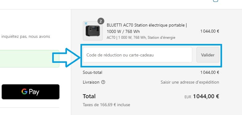 - Sur la page de paiement, repérez l’encart "Code de réduction ou carte cadeau" et collez votre code promo BLUETTI dans cet espace. Vérifiez qu’il a bien été appliqué avant de finaliser votre achat.