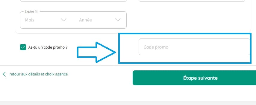 - Avant de finaliser la réservation, repérez la case "As-tu un code promo ?" sur la page de paiement.