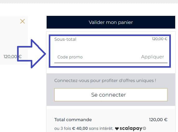 - Lors de la validation de votre commande, repérez l’espace réservé à l’ajout d’un code de réduction, intitulé “Code promo”.