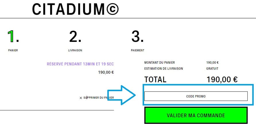 - Lors de la validation de votre commande, recherchez le champ intitulé “Code promo”. C'est dans cette case que vous pourrez insérer votre code promo Citadium.
