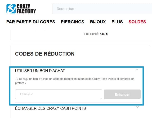 - Ensuite, dans votre panier, repérez le champ dédié aux bons de réduction nommés “Code de réduction”. Mettez votre code promo Crazy Factory dans cette case.