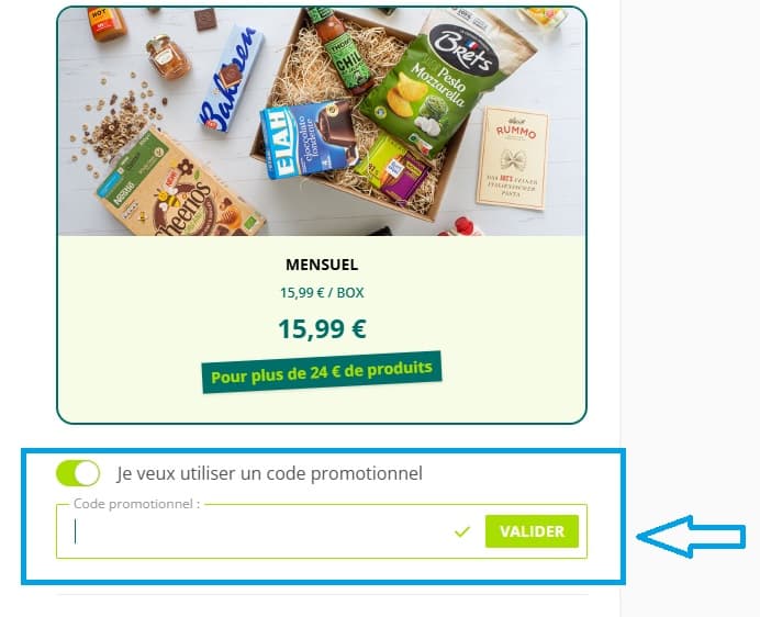 - Commencez par sélectionner un code promo DegustaBox valide. Vérifiez qu’il est applicable au type d'abonnement ou au box cadeau de votre choix.