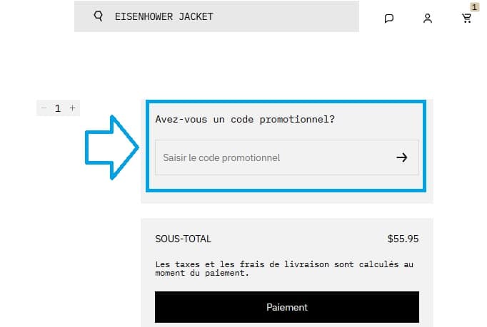 - Puis, repérez la case nommée “Avez-vous un code promotionnel ? ” et insérez votre code promo Dickies.