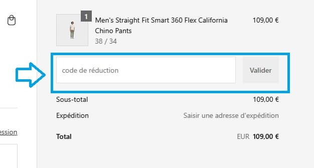 - Ensuite, avant de régler votre commande, recherchez la section intitulée “Code de réduction” et entrez votre code promo Dockers dans cette case.