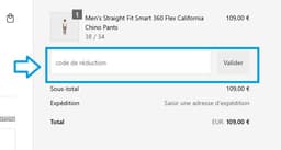 - Ensuite, avant de régler votre commande, recherchez la section intitulée “Code de réduction” et entrez votre code promo Dockers dans cette case.