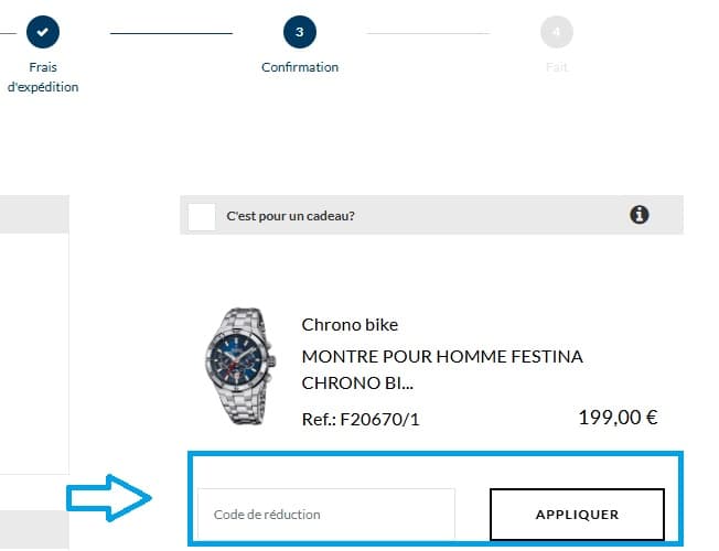 - Ensuite, recherchez l’espace dédié au code promo nommé “Code de réduction” et mettez votre code promo Festina dans ce champ, puis cliquez sur "Appliquer". Vérifiez que la réduction a bien été prise en compte avant de finaliser votre commande en toute sécurité.