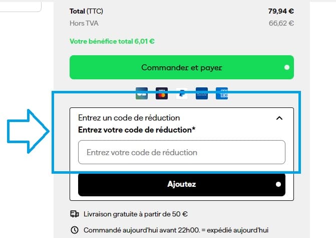 - Puis validez-le en cliquant sur le bouton “Ajouter”. Assurez-vous que la réduction est bien appliquée en vérifiant le montant total de votre commande.