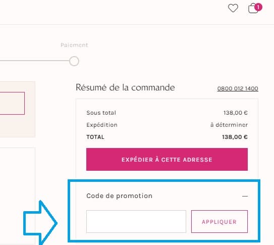 - Sur la page de récapitulatif de commande, repérez le champ intitulé “Code de promotion” et saisissez votre code avantage Free People dans cet espace.