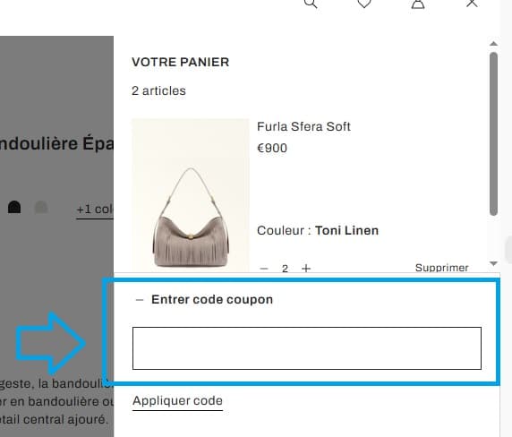 - Dans la section " Entrer un code coupon", saisissez votre code avantage Furla et cliquez sur "Appliquer ce code" pour appliquer la réduction.