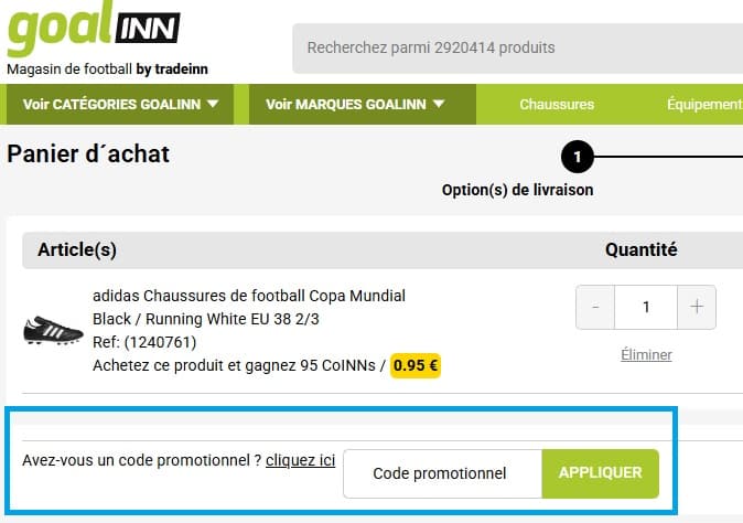 - Lors de la validation de votre commande, cliquez sur le lien “Avez-vous un code promotionnel ?” et mettez votre code promo Goalinn dans le champ “Code promotionnel”.