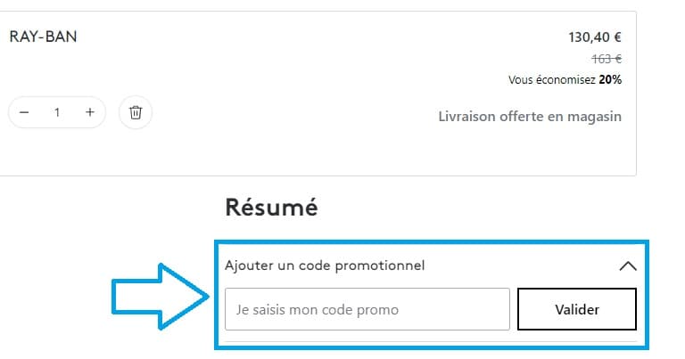 - Ensuite, repérez le champ "Ajouter un code promotionnel", puis mettez votre code avantage GrandOptical dans cet espace.