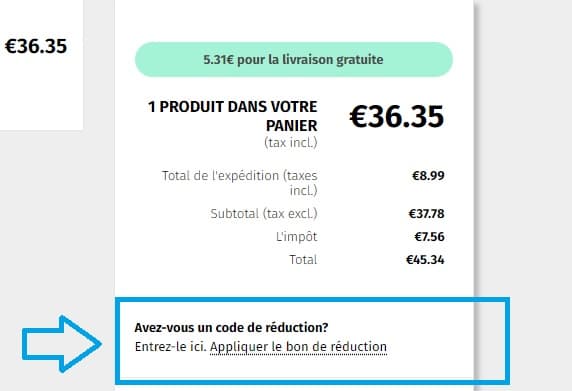 - Ensuite, repérez la section intitulée “Avez-vous un code de réduction ? ”. Puis, cliquez sur le lien “Appliquer le bon de réduction” et insérez votre code promo GreenIce dans la case qui apparaît.