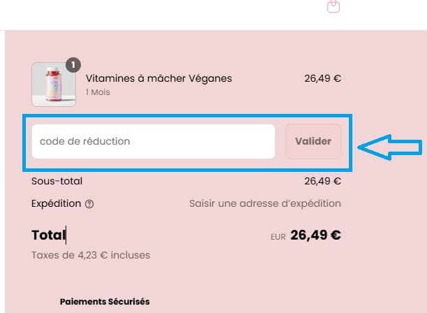 - Vous y trouverez un champ dédié aux bons de réduction. Il vous suffit de coller votre code promo Hairburst dans cet espace, puis de valider pour activer l'avantage.