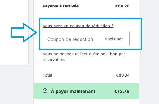 - Ensuite, recherchez la case dédiée intitulée “Vous avez un coupon de réduction ?” et mettez votre code promo Hostelworld dans cette case.