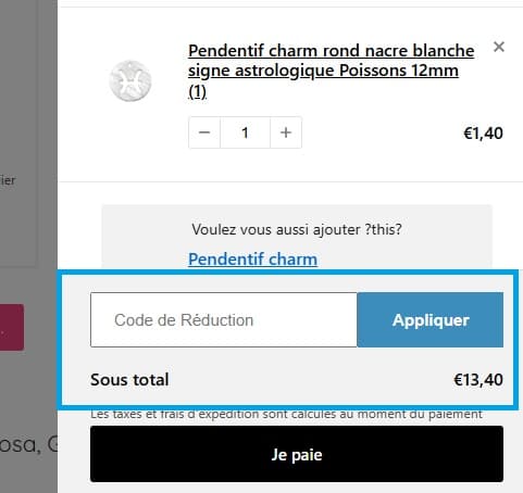 - Au moment de valider votre commande, recherchez le champ dédié aux codes promotionnels, saisissez votre code promo I-Perles dans le champ “Code de réduction”.